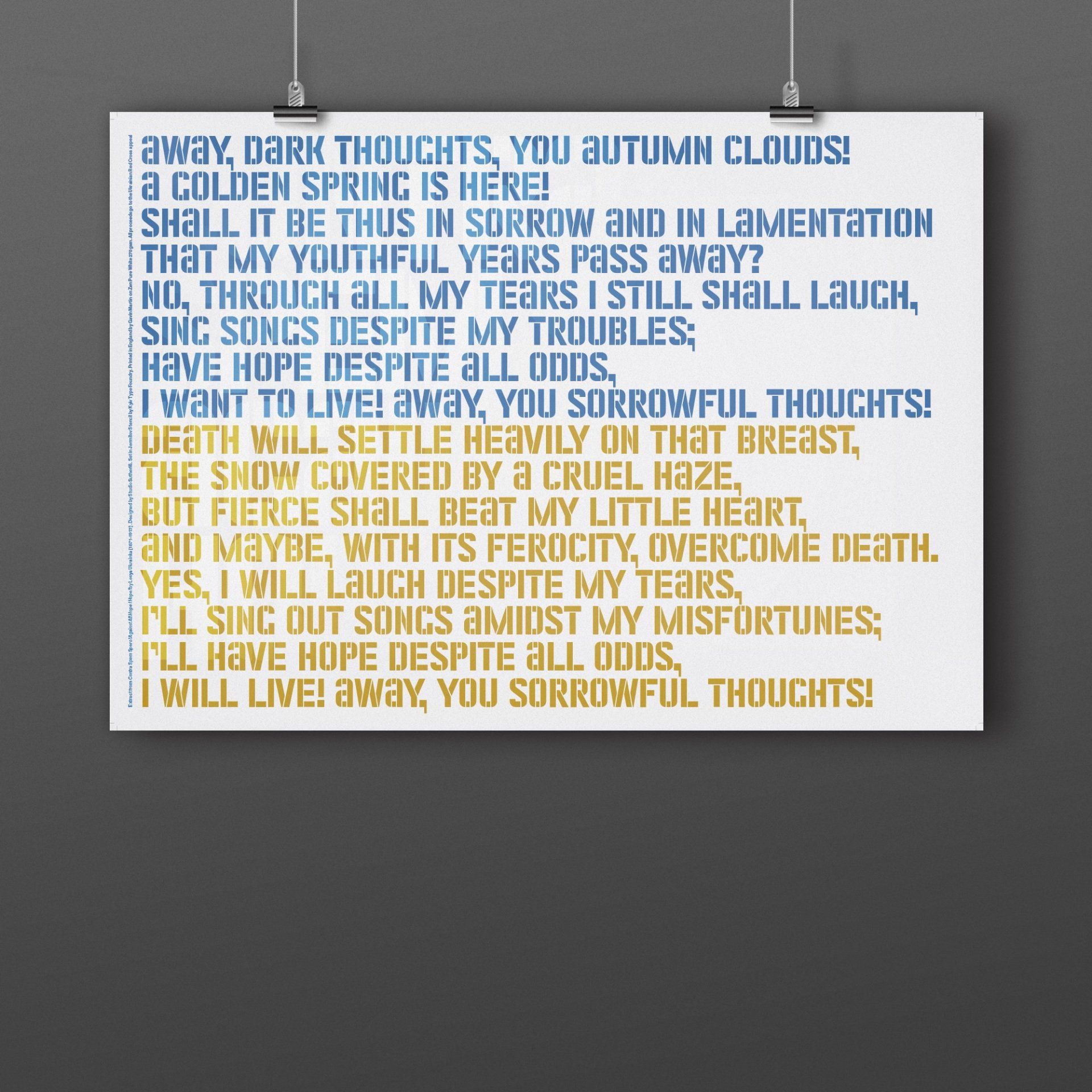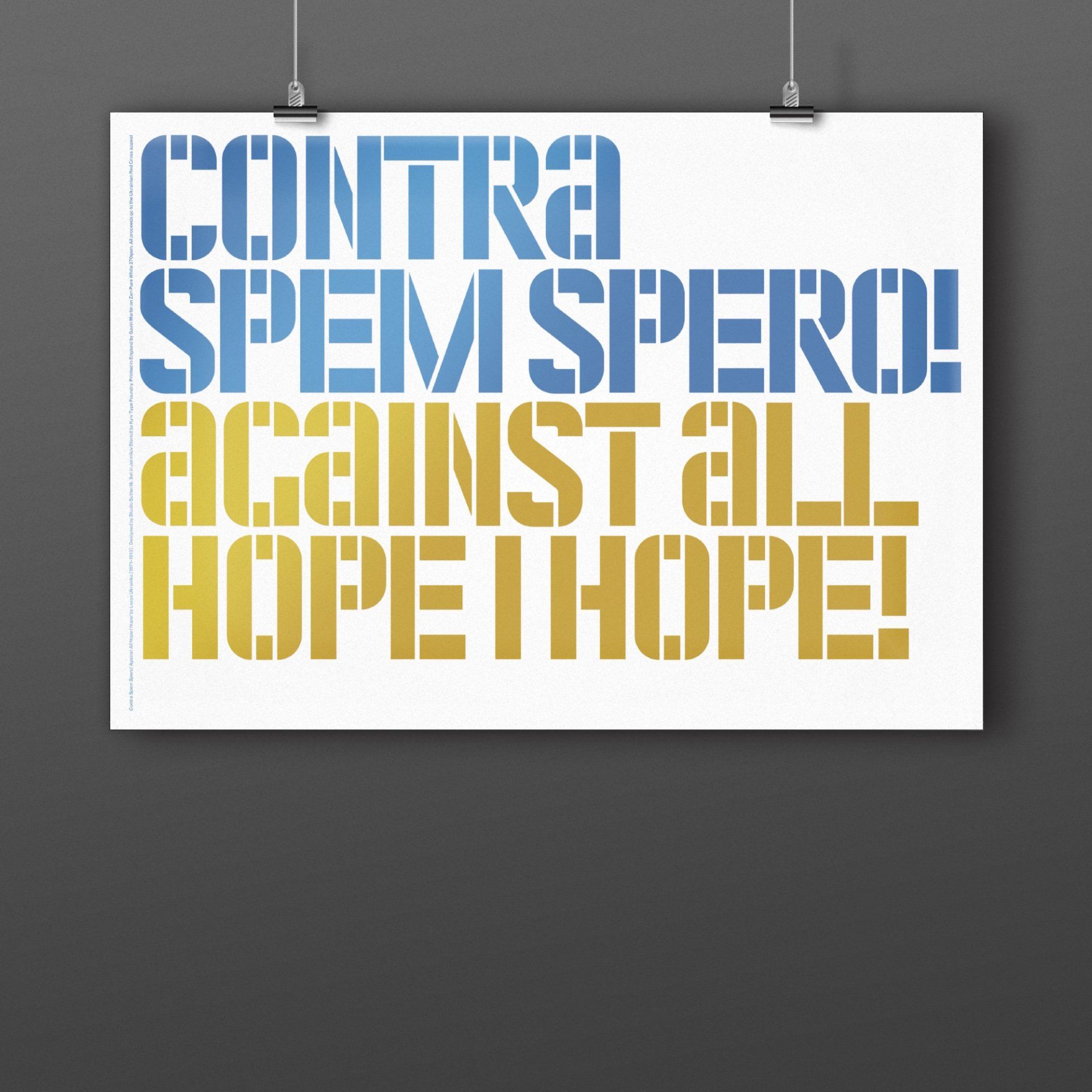 Studio Sutherl& have created two unique posters in support of Ukraine. Their inspiration behind the design is wonderfully fitting. The graphics are an extract from 'Contra Spem Spero! Against All Hope I Hope!' by Lesya Ukrainka, a renowned Ukrainian poet and set in a Ukrainian typeface, Jermilov Stencil by @kyiv_type_foundry.