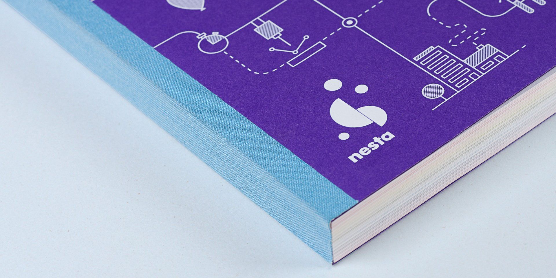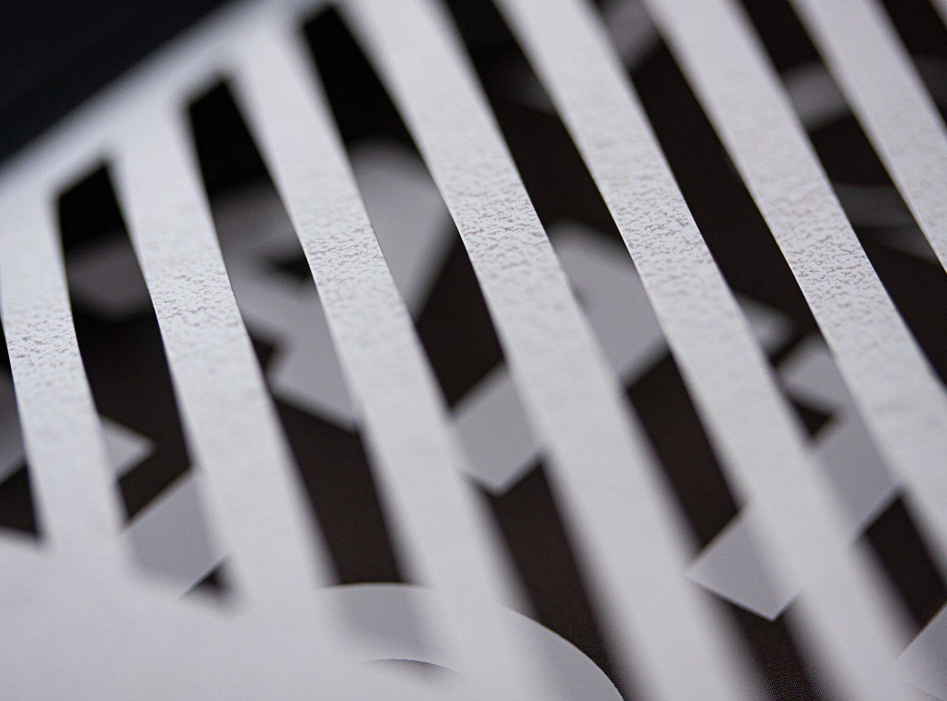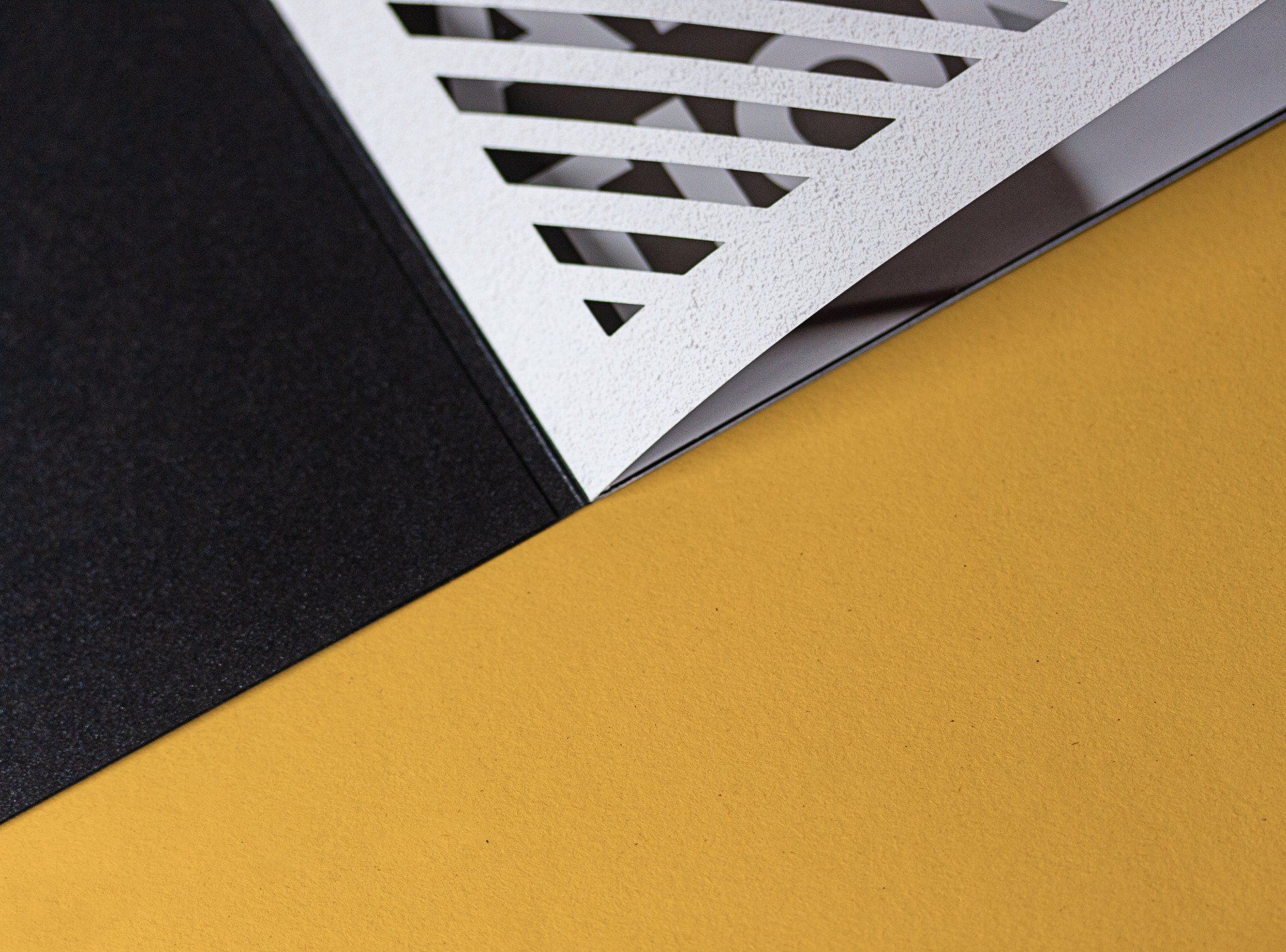 A bespoke, digitally printed book with 14 separate die-cut sections, lay-flat bind, wing-creased cover and finished with a Colorado Congo taped spine.